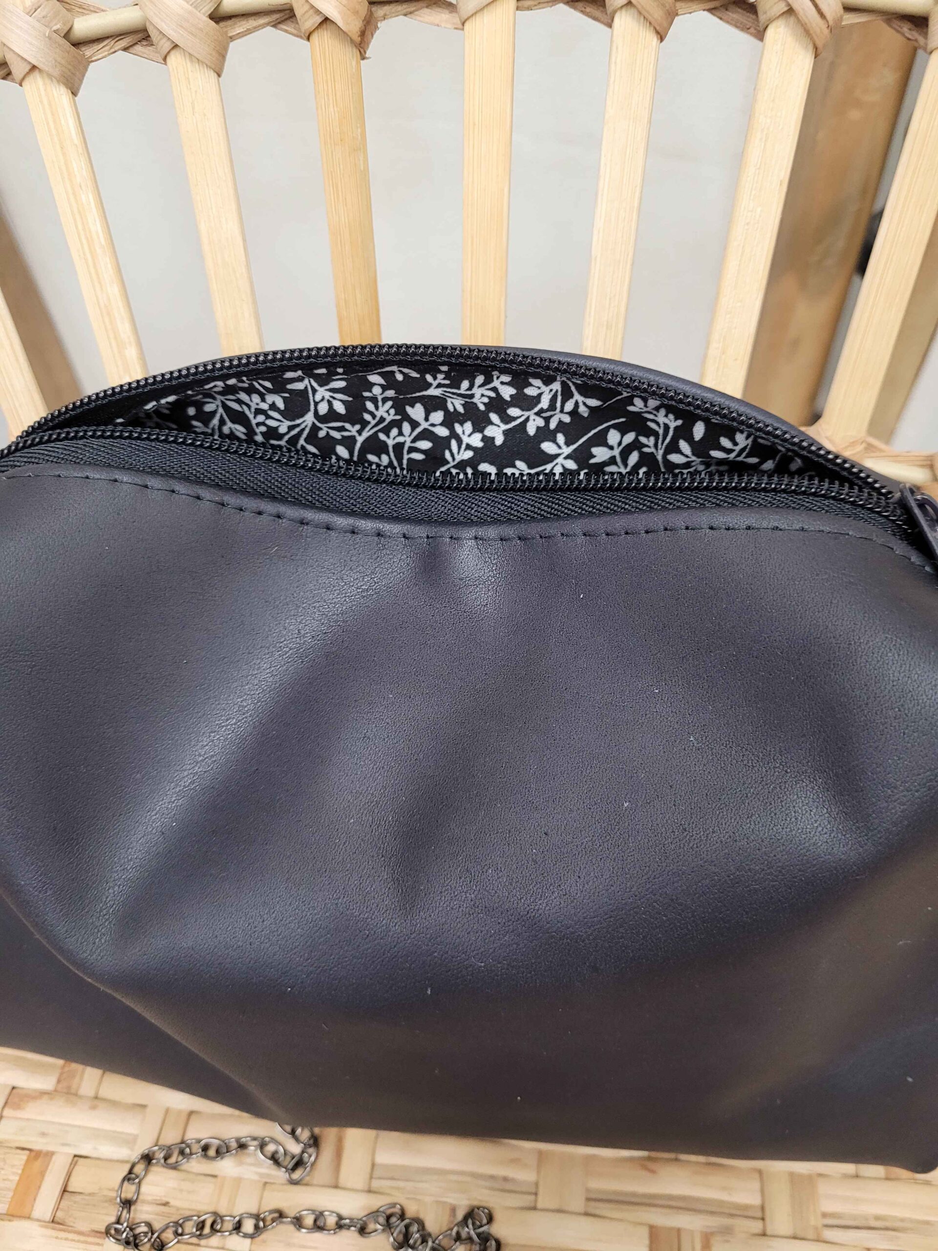 Bolso confeccionado con piel de color negro, interiormente está forrado con tela de algodón.