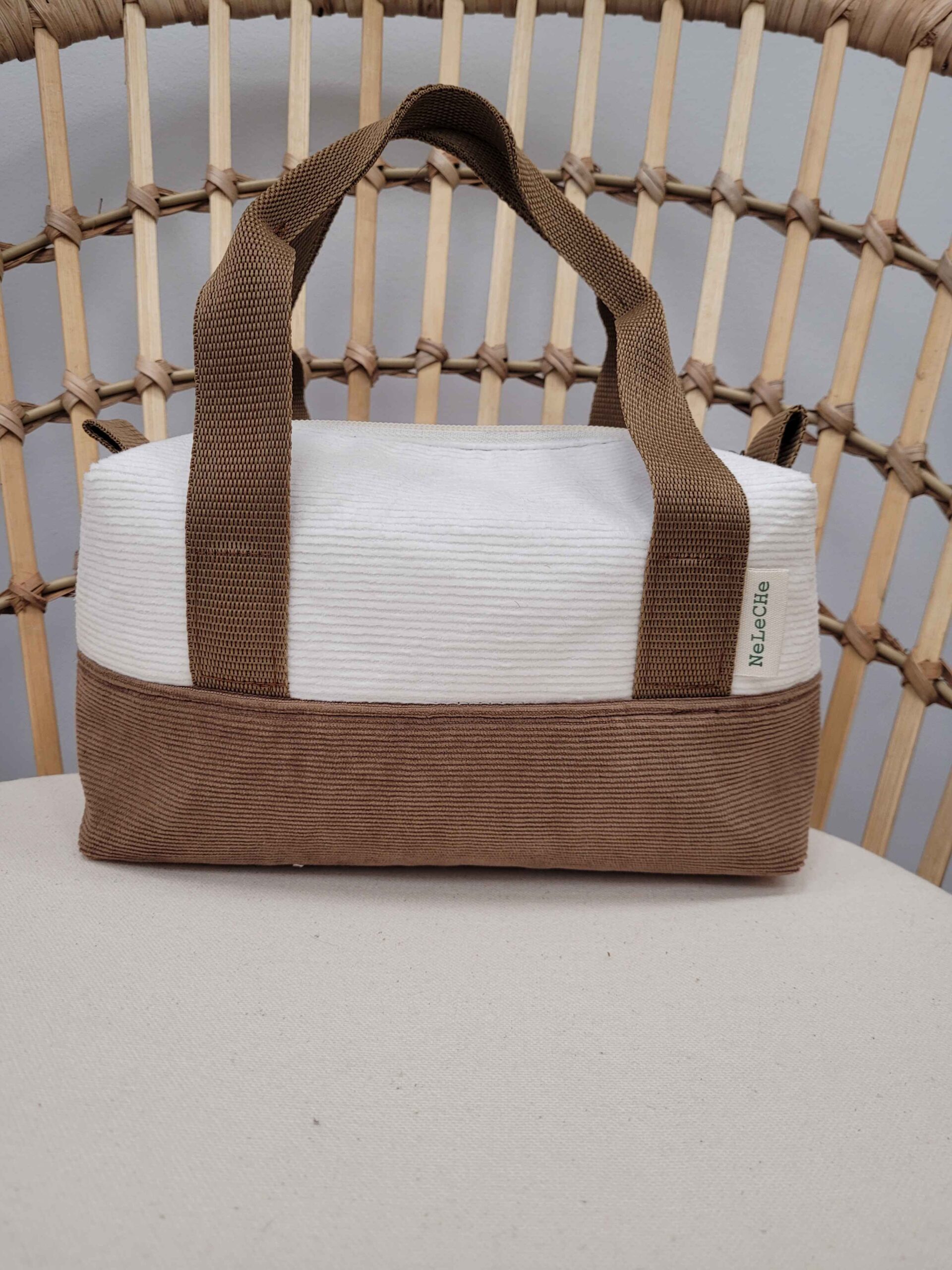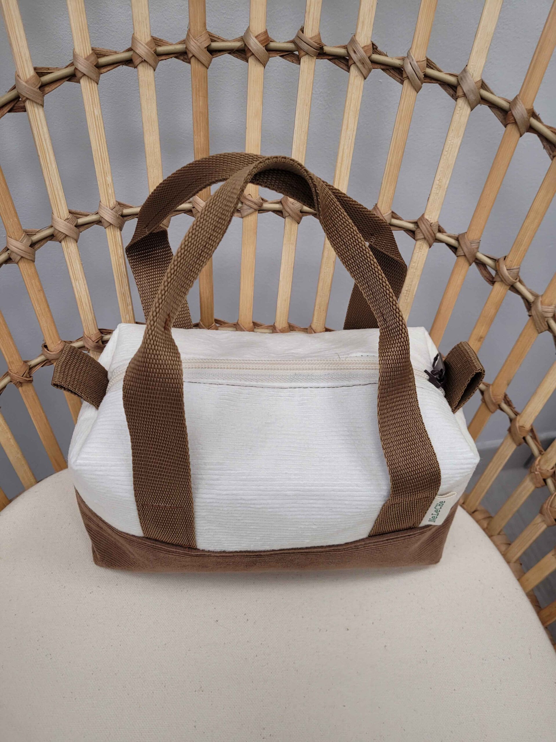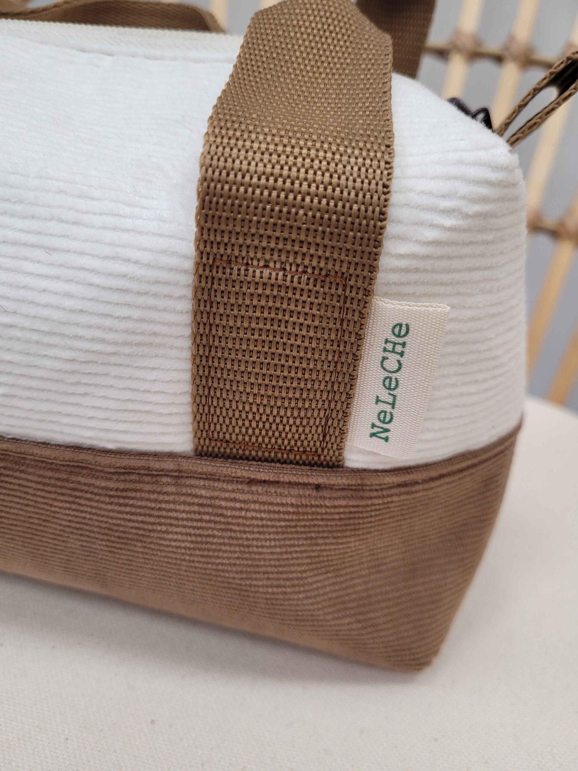 Bolso bombón confeccionado con tela de pana cruda y marrón. Interiormente está forrado con tela de algodón de color marrón. Entre las dos telas lleva una guata acolchada para dar forma.