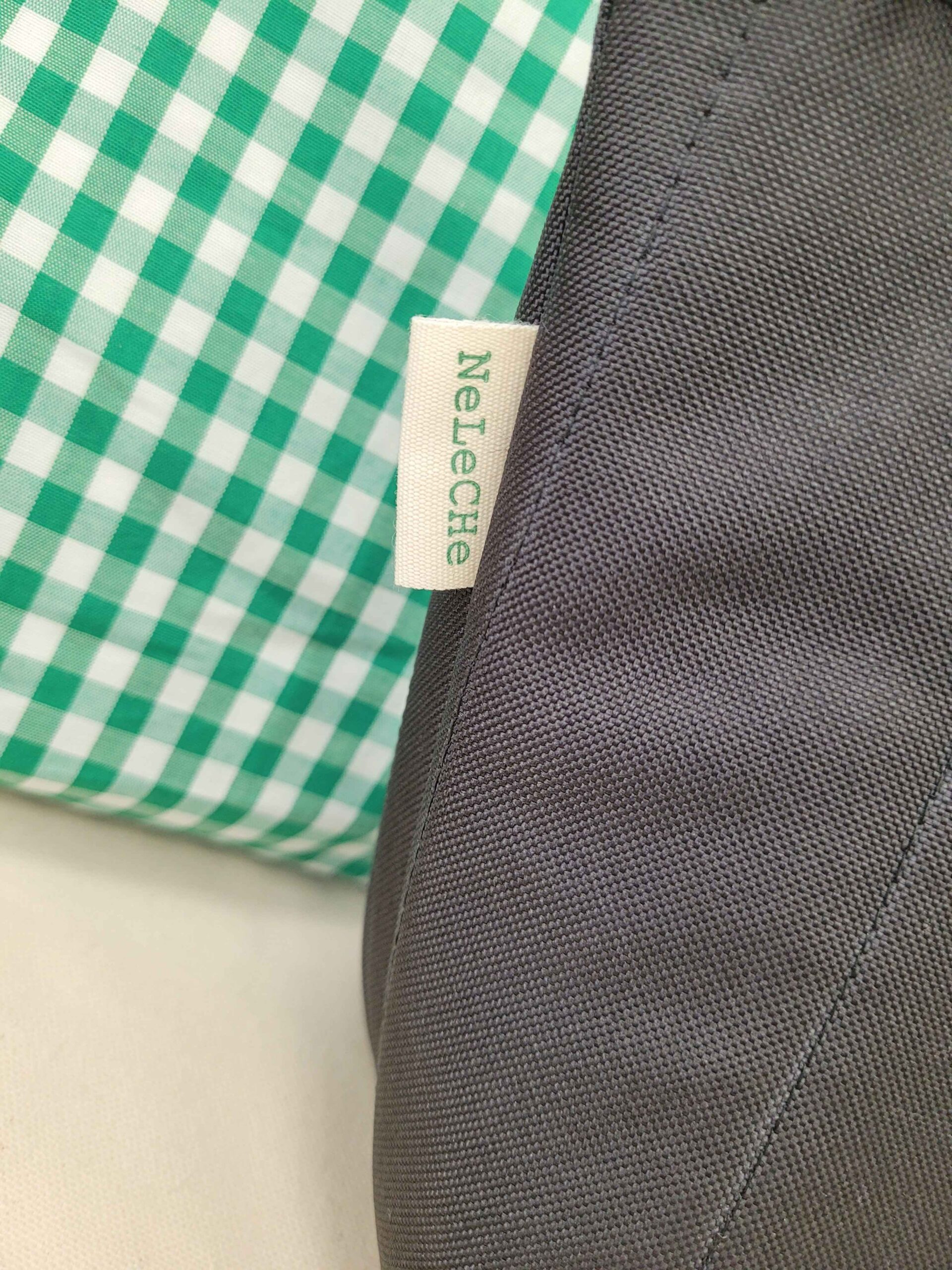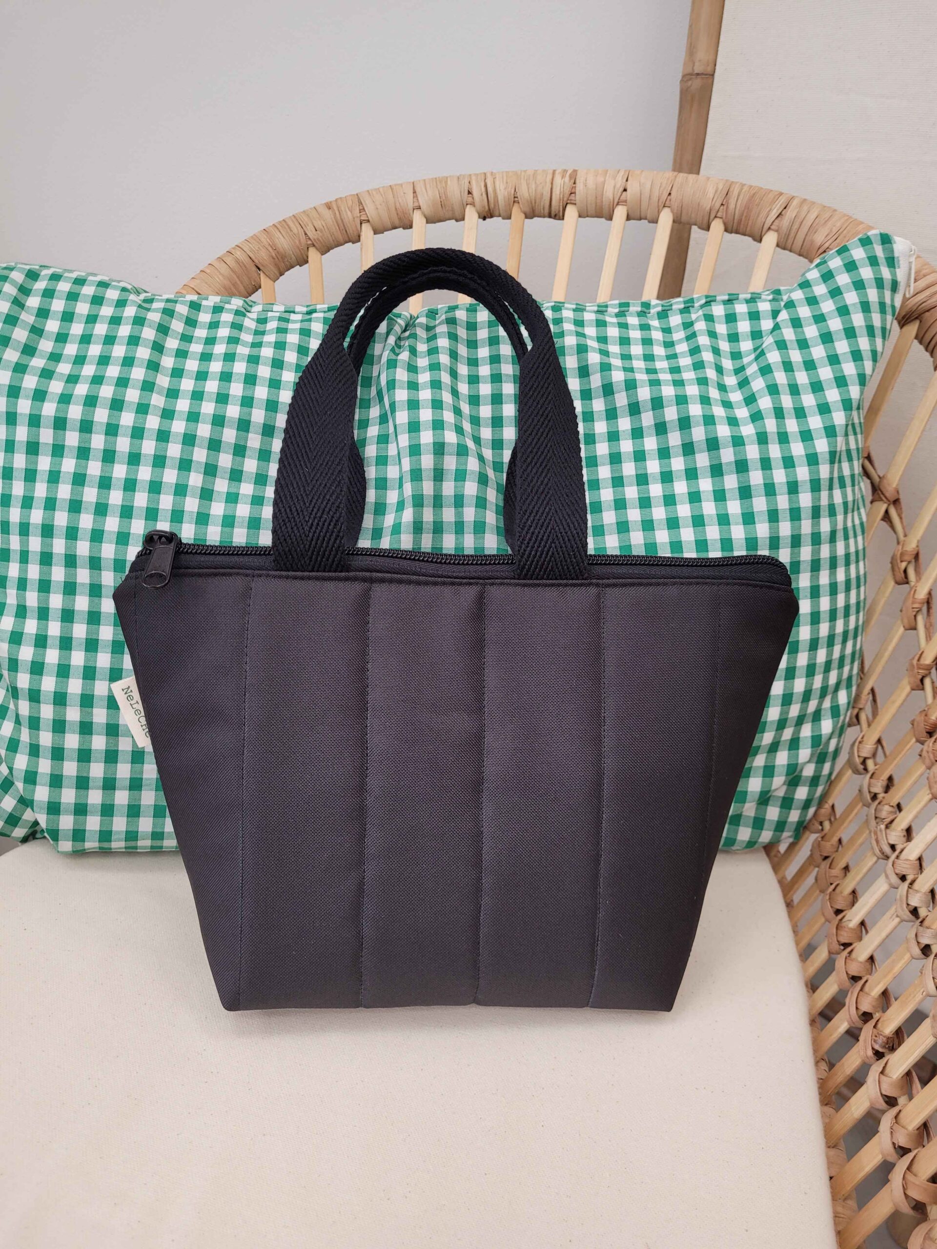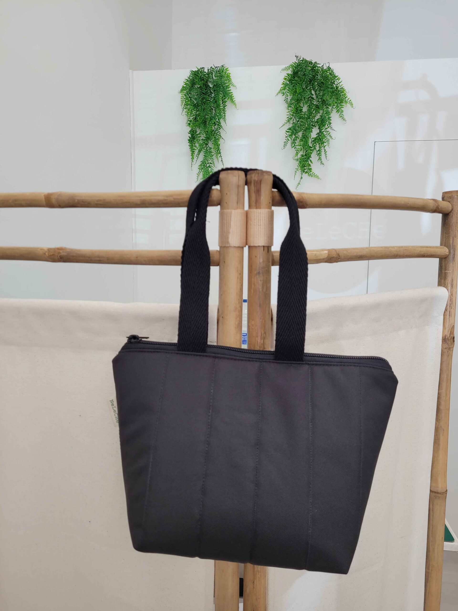 Bolso confeccionado con tela impermeable de color negro, interiormente está forrado con la misma tela impermeable. Entre las dos telas lleva un estabilizador para dar forma al bolso. Cuenta con un bolsillo interior.