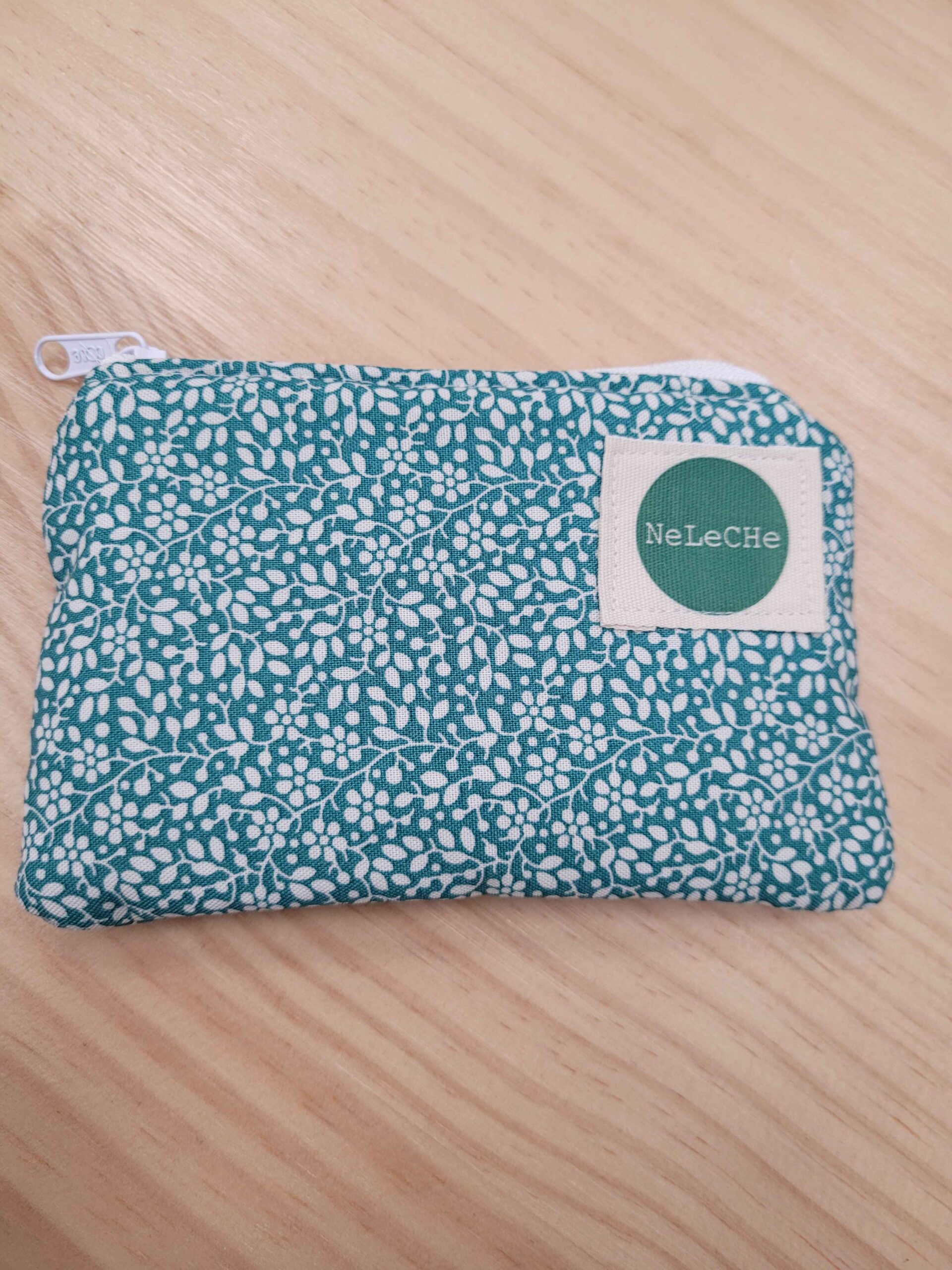 Monedero confeccionado con tela de algodón con estampado de flores, interiormente está forrado con guata acolchada.