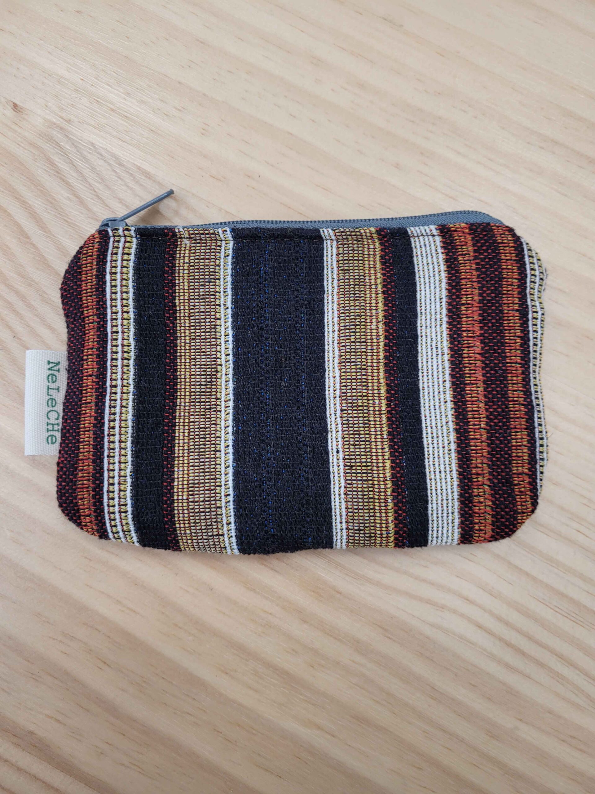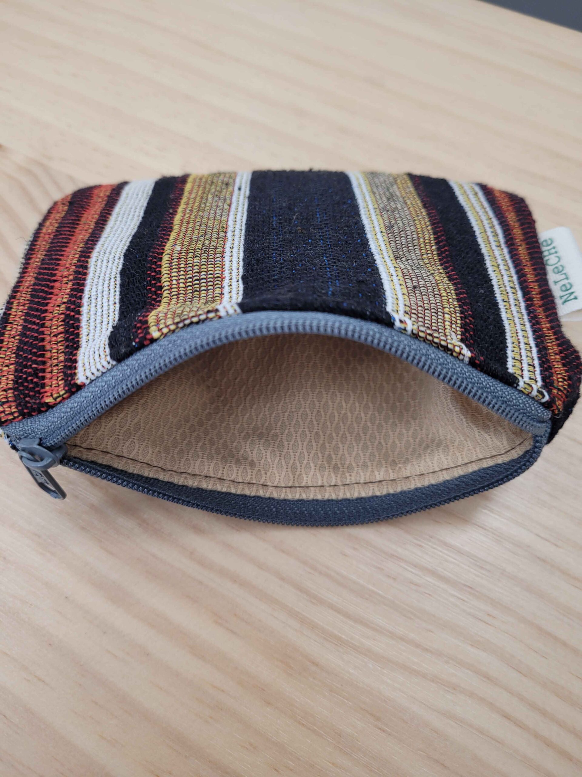 Monedero confeccionado con loneta, interiormente está forrado con tela de algodón de color marrón.