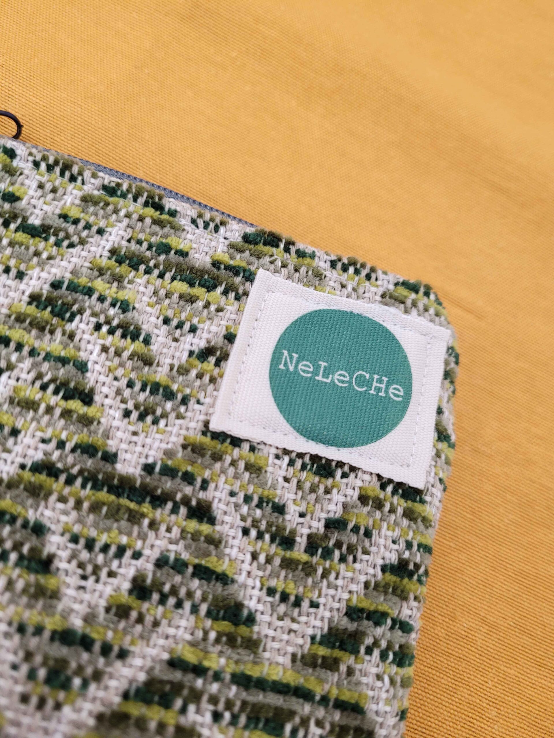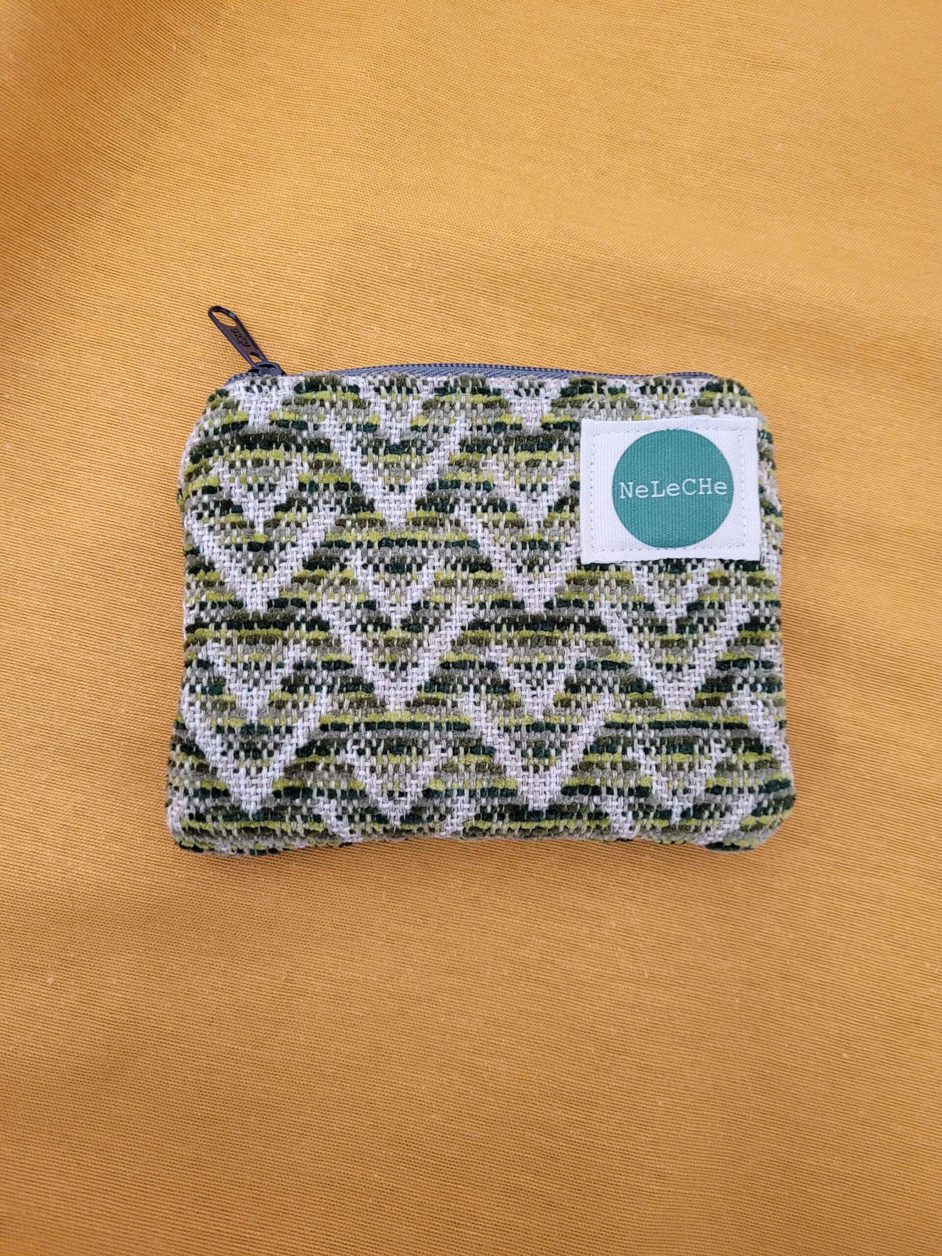 Monedero confeccionado con tela de tapicería, interiormente está forrado con tela de algodón de color blanco.
